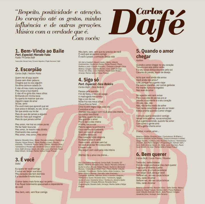 Discover the magic of the 'Black Rio' swing with Carlos Dafé's vinyl record "Welcome to the Dance." This seventh album by the Rio de Janeiro soulman, released by Atração Fonográfica, captures the essence of soul music with collaborations from icons like Marcelo Yuka and Zeca Baleiro. With tracks that pay tribute to the past and embrace the present, this vinyl is an essential piece for lovers of Brazilian music. Get it now and relive the energy of the 70s with Dafé's unmatched authenticity and talent.
