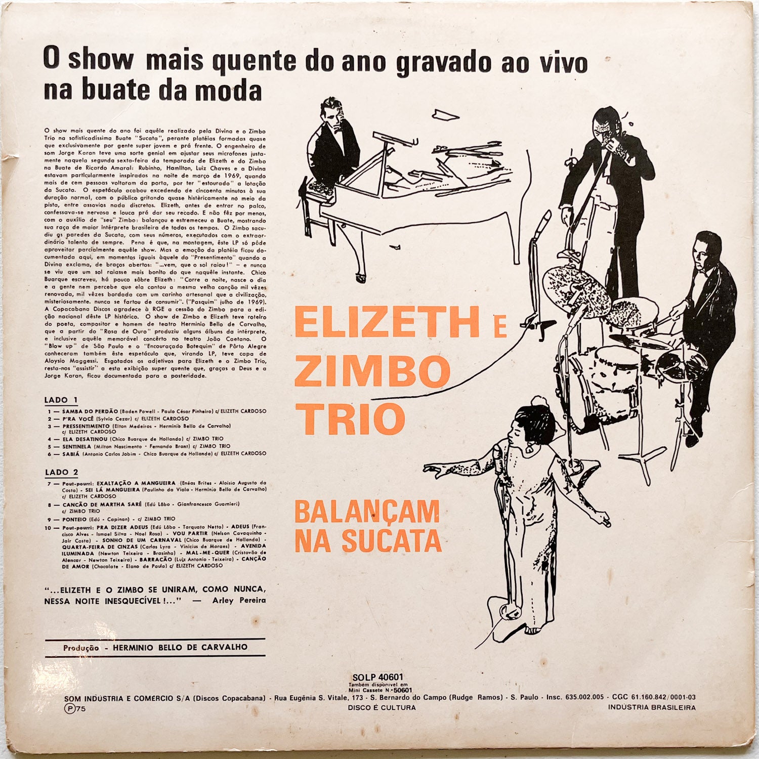 Discover the magic of Brazilian music with the LP "Elizeth E Zimbo Trio Balançam Na Sucata," an unforgettable collaboration between the legendary singer Elizeth Cardoso and the talented Zimbo Trio. This iconic album, released under the Copacabana label, captures the essence of bossa nova and samba-jazz, offering a rich and authentic listening experience. Produced in Brazil, this vinyl record is an essential piece for music lovers who wish to explore the sophistication and emotion of 1960s Brazilian music. Get it now and let yourself be carried away by the captivating rhythms and the remarkable voice of Elizeth Cardoso, accompanied by the unmatched instrumental skill of the Zimbo Trio.