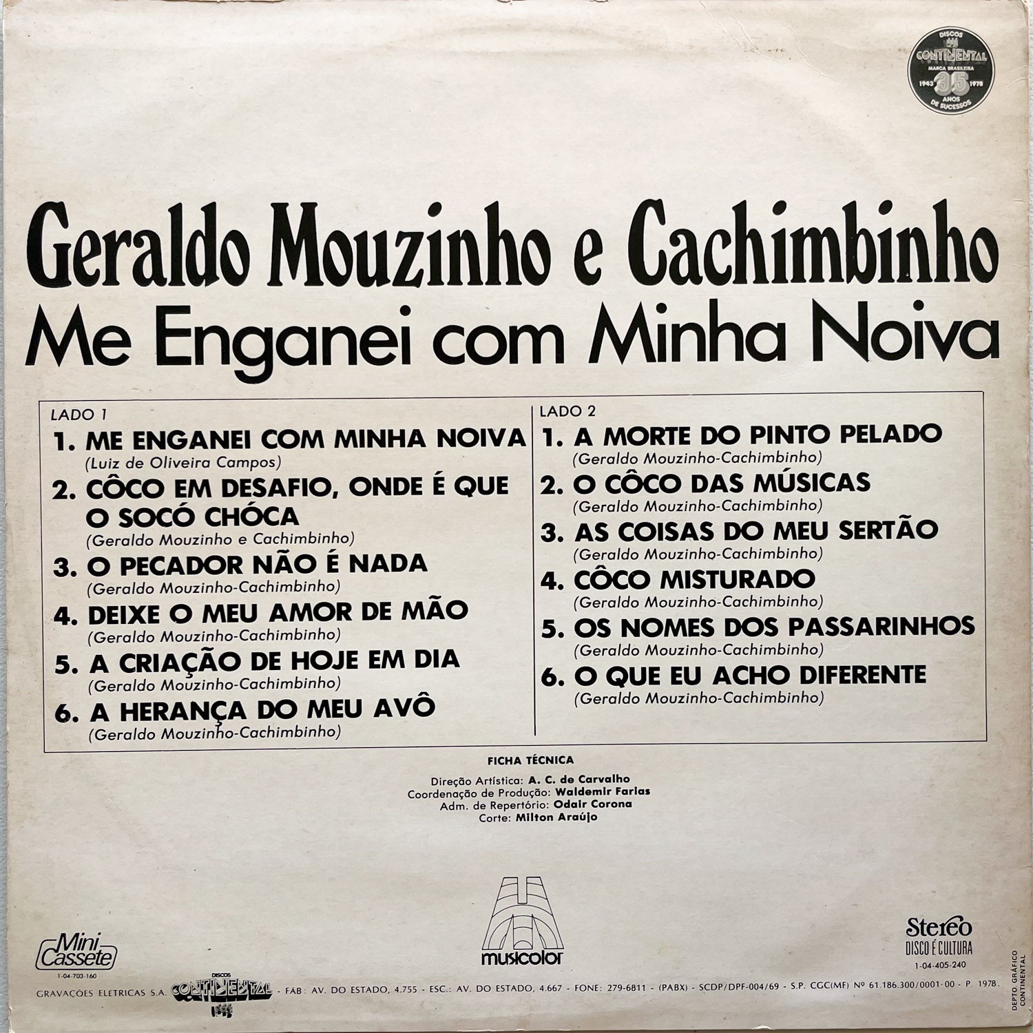 Discover the charm of Brazilian music with the LP "Me Enganei Com Minha Noiva" by Geraldo Mouzinho e Cachimbinho. Released under the Musicolor (3) label, this vinyl record transports you to the heart of Brazil with its authentic melodies and captivating lyrics. Perfect for collectors and music lovers, this album captures the essence of Brazilian musical traditions with a unique sound. Add this treasure to your collection and experience the cultural richness of Brazil in every track.